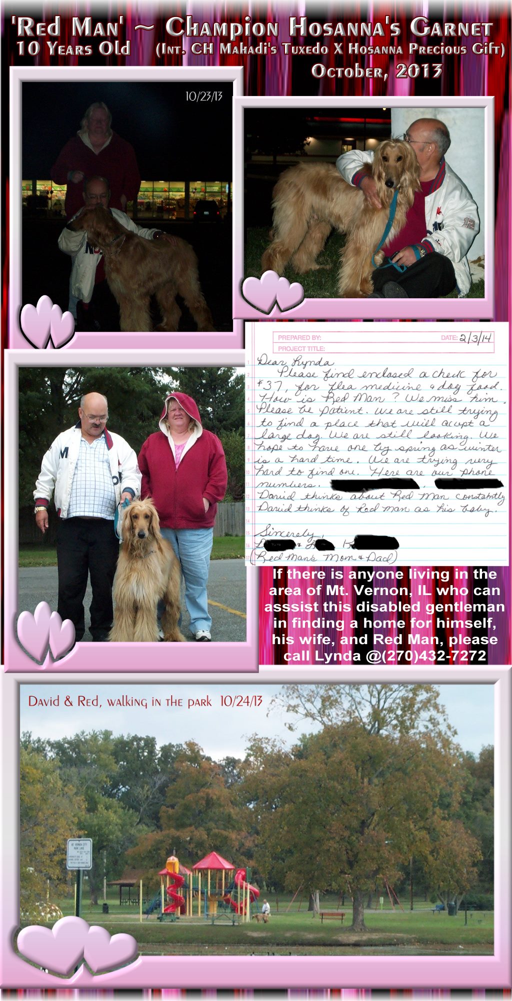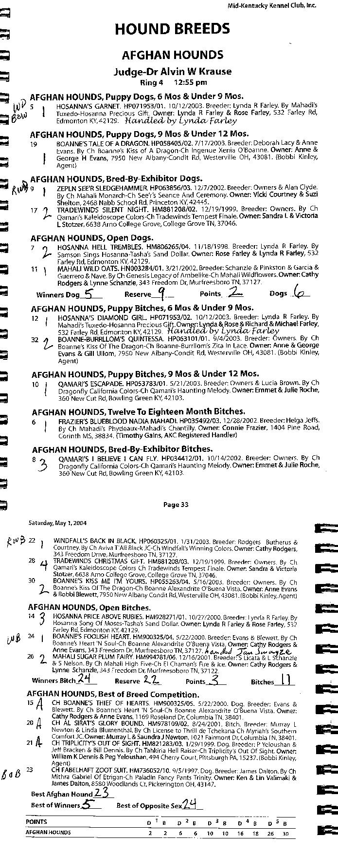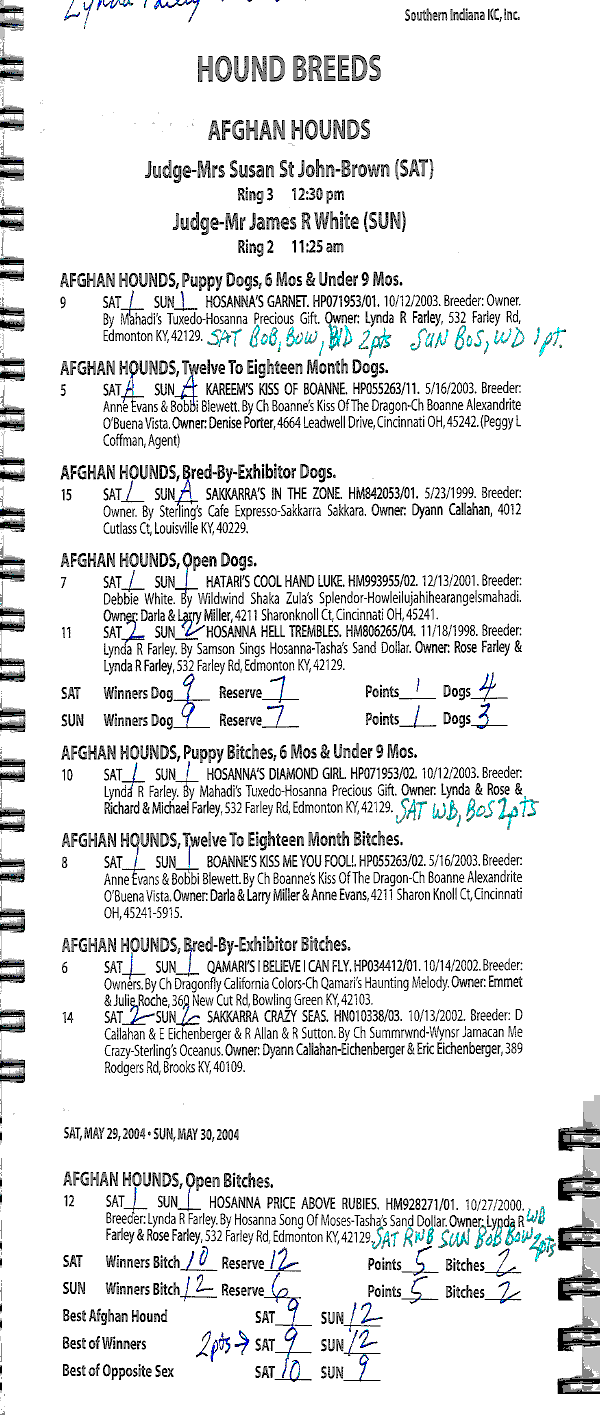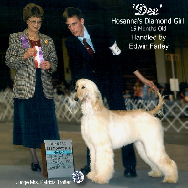 Hosanna Afghan Hounds Breeder: Lynda R. Farley 532 Farley Road Edmonton, KY, 42129 (270)432-7272 http://www.hosanna1.com/Hounds/ Email: jlfarley@scrtc.com |