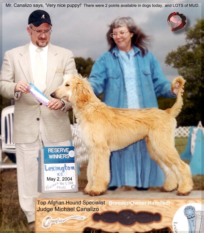 Red is a SIRE: PUPPIES 3/9/06 When Red retires, he will have a new, proud daddy! David Kinison has promised to love him, and spoil him for life, in Mt. Vernon, IL. At his first shows, Red was undefeated in puppy classes, & there was competition from several top kennels + prof. handlers who've won Afghan Hound Club of America National Specialty & Westminster! He & his sister were the youngest puppies in the ring. As of 5/30/04, at 7 months and 1 week old, Red has 6 points and a major already! Southern Indiana KC, Corydon, IN 5/30 Winner's Dog, Best of Opposite Sex -1 point Judge Mr. James White 5/29 Winner's Dog, Best of Winners & Best of Breed 2 points - Judge Mrs. Susan St. John Brown 5/2 Lexington KC, Lexington, KY - >Reserve Winner's Dog Judge Michael Canalizo(! Top Afghan Hound expert: ) (the competition at Lexington was similar to Mid-KY) 5/1 Mid Kentucky KC, Winner's Dog & Best of Winners 3 points/ MAJOR Win : ) Judge Dr. Alvin Krause |