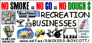 A few years ago, in The People's Republic of California, all 12 Six Flags parks were FOR SALE. They were LOSING MONEY. They had gone 'smoke free' the year before, to be more 'family friendly'. Guess what they forgot??? SMOKERS HAVE FAMILIES. And, if we believe the demographics, that more smokers are from 'lower socioeconomic' groups, GUESS WHO HAS THE MOST children??? I have 6 kids and 7 (so far) grandkids. And remember, 'If Momma ain't happy, ain't NOBODY happy'. Guess where we DO NOT eat if we have KIDS WITH us (husband smokes TOO), and I don't want kids eating in my vehicle? Yup, NO FAST FOOD - NO McDONALDS if I have kids with me! Business people, it is VERY SHORT SIGHTED to believe the low numbers of smokers the propaganda people put out. You are losing NOT ONLY your SMOKING customers, but ALSO in many cases, SMOKER'S FAMILIES AND FRIENDS! Here is an HONEST report about the REAL COSTS of SMOKING BANS (prohibition) CLICK HERE - FREE REPORT MANY OTHER states are NOW LOSING HUGE MONEY, because they have FAILED to PAY ATTENTION to WHAT'S HAPPENING to the economy in The People's Republic of California. The ECONOMY of the USA was going DOWN BEFORE the gas prices went haywire - and BEFORE the MORTGAGE and BANK crisis. SMOKING BAN LOSSES NATIONWIDE IS ONE REASON WHY! On top of all that, smokers ARE getting TIRED and TICKED OFF with SEGREGATION & DISCRIMINATION- even though it's now smokers, instead of black people. The traffic on my SMOKERS BOYCOTT webpage has been TRIPLING EVERY WEEK lately! Boycotting IS NOT the reason for losses due to bans in the above report. Simple behavior changes of 10s of millions of smokers, NOT going where they are NOT comfortable is, but certainly by now BOYCOTTING is ADDING to those losses, at least to some degree. |