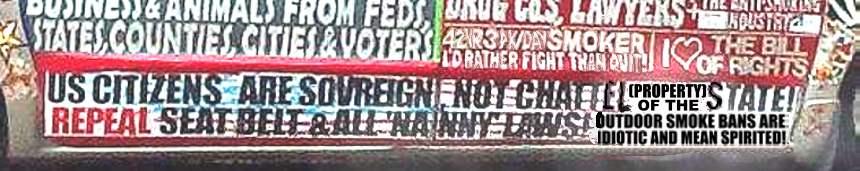 Along the lowest part of both sides, there is a long sign that goes across both doors. "US CITIZENS ARE SOVEREIGN, NOT CHATTEL (PROPERTY) OF THE STATE", AND "OUTDOOR SMOKE BANS ARE IDIOTIC AND MEAN SPIRITED". |